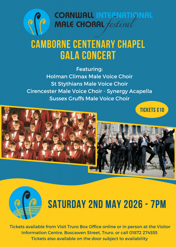 The Choir are delighted to one again be hosting one of the regional concerts of the Cornwall International Male Choral Festival at Camborne Centenary on Saturday 2nd May 2026 at 7:00pm.